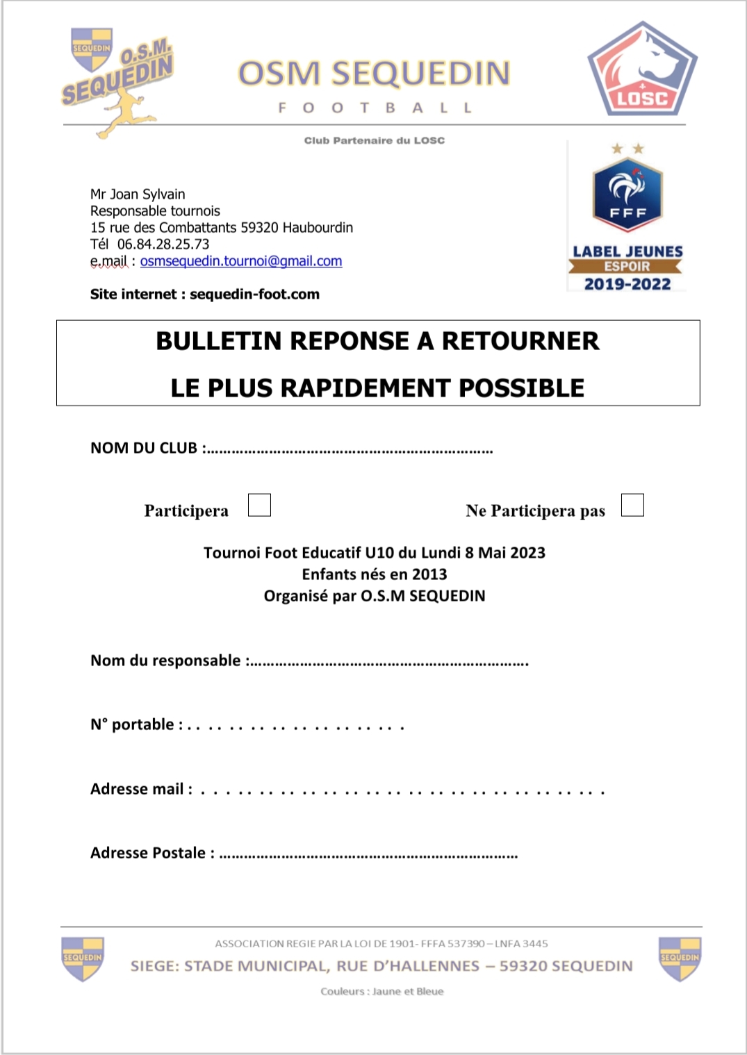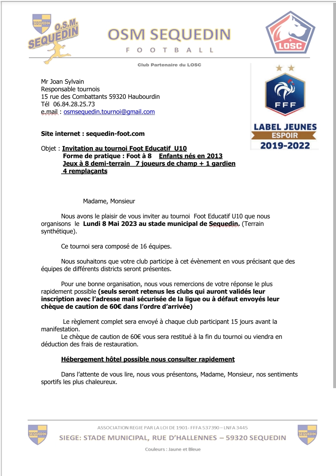 Nous avons le plaisir de vous inviter au tournoi Foot Educatif U10 que nous organisons le Lundi 8 Mai 2023 au stade municipal de Sequedin. (Terrain synthétique).